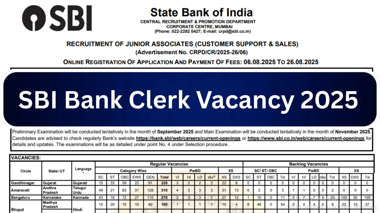 State Bank of India (SBI) has announced the recruitment for Junior Associate (Clerk) positions. A total of 6589 vacancies are available. The online application process starts on August 6, 2025, and closes on August 26, 2025. Interested and eligible candidates can apply through the official SBI website.